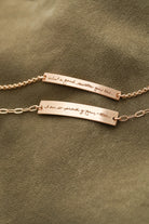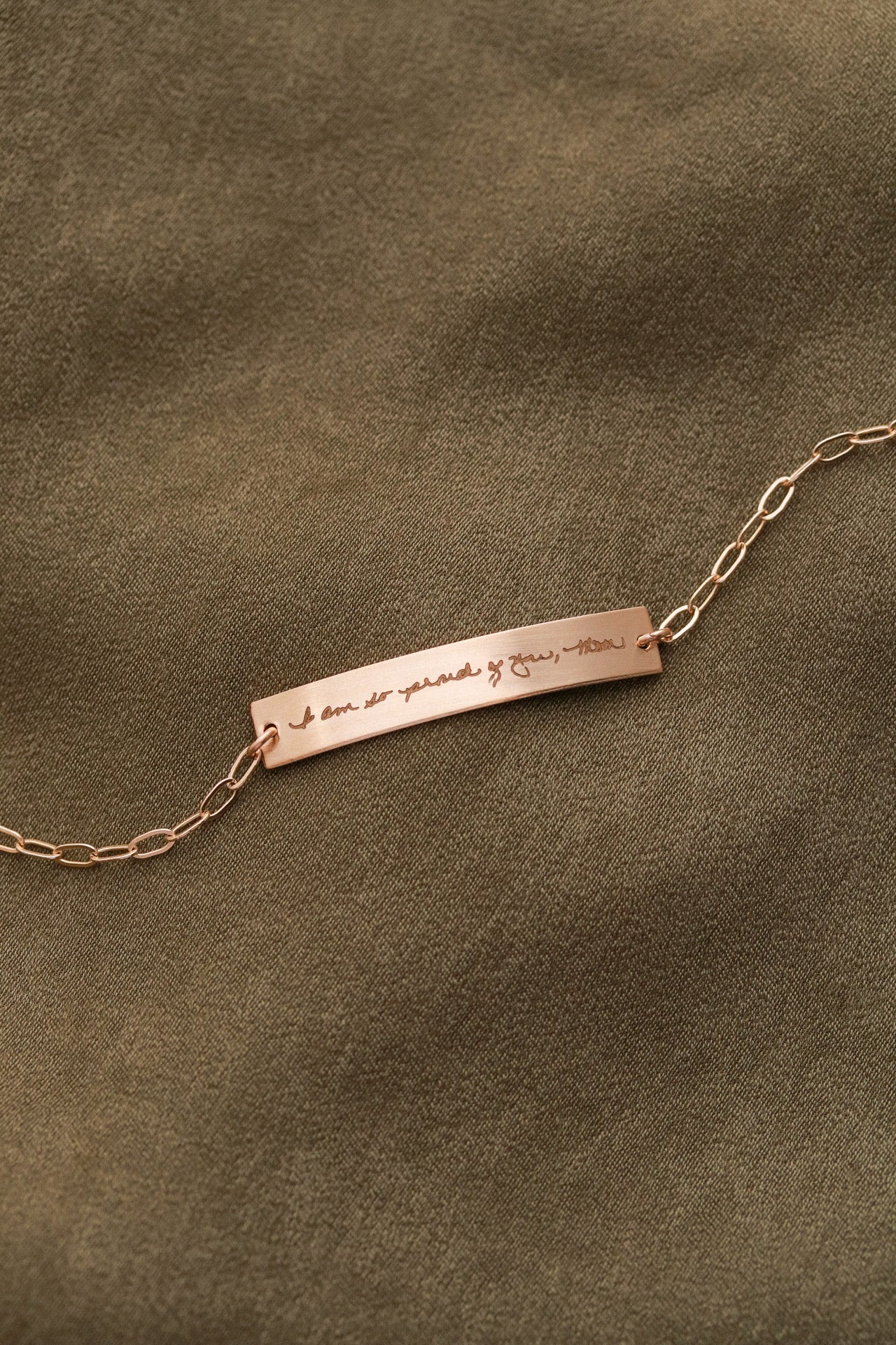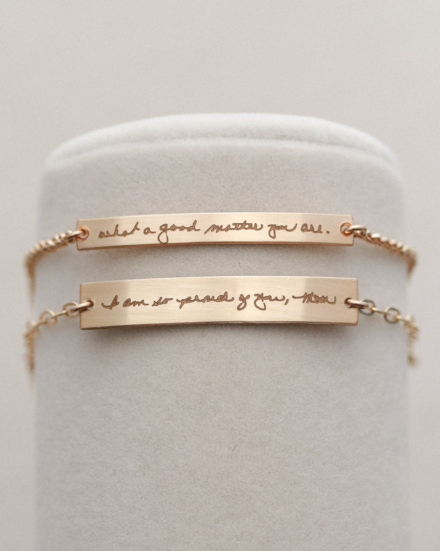 Turn a loved one’s handwriting into a timeless piece of jewelry. Our Handwriting Bar Bracelet takes a photo of handwriting or a drawing and engraves it onto a sleek bar for a truly personal keepsake.