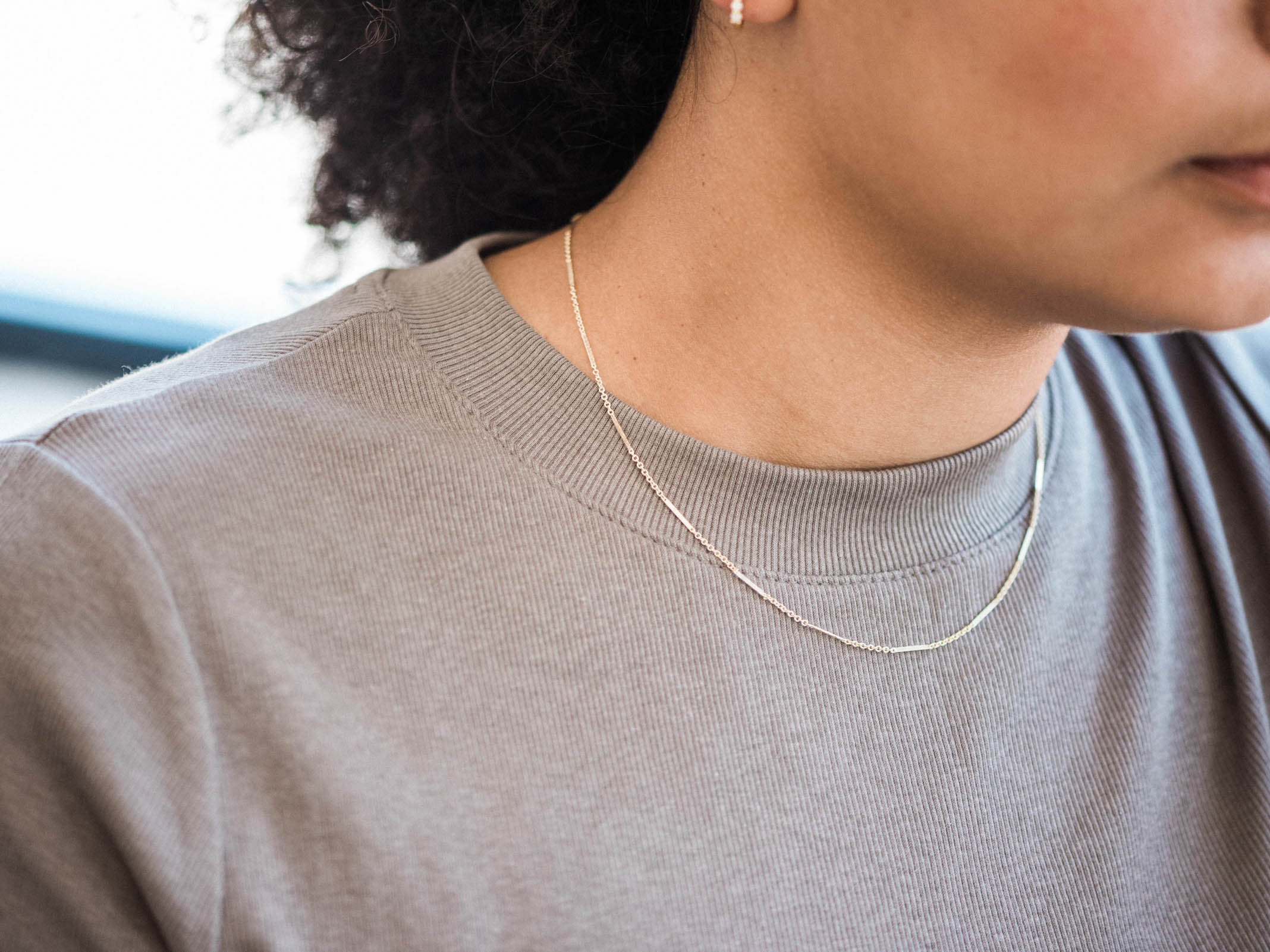 Why we love this chain: when the light catches the bars they sparkle and shine, like a glittery chain. All 14k gold filled or sterling silver materials with a lobster clasp closure.