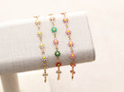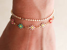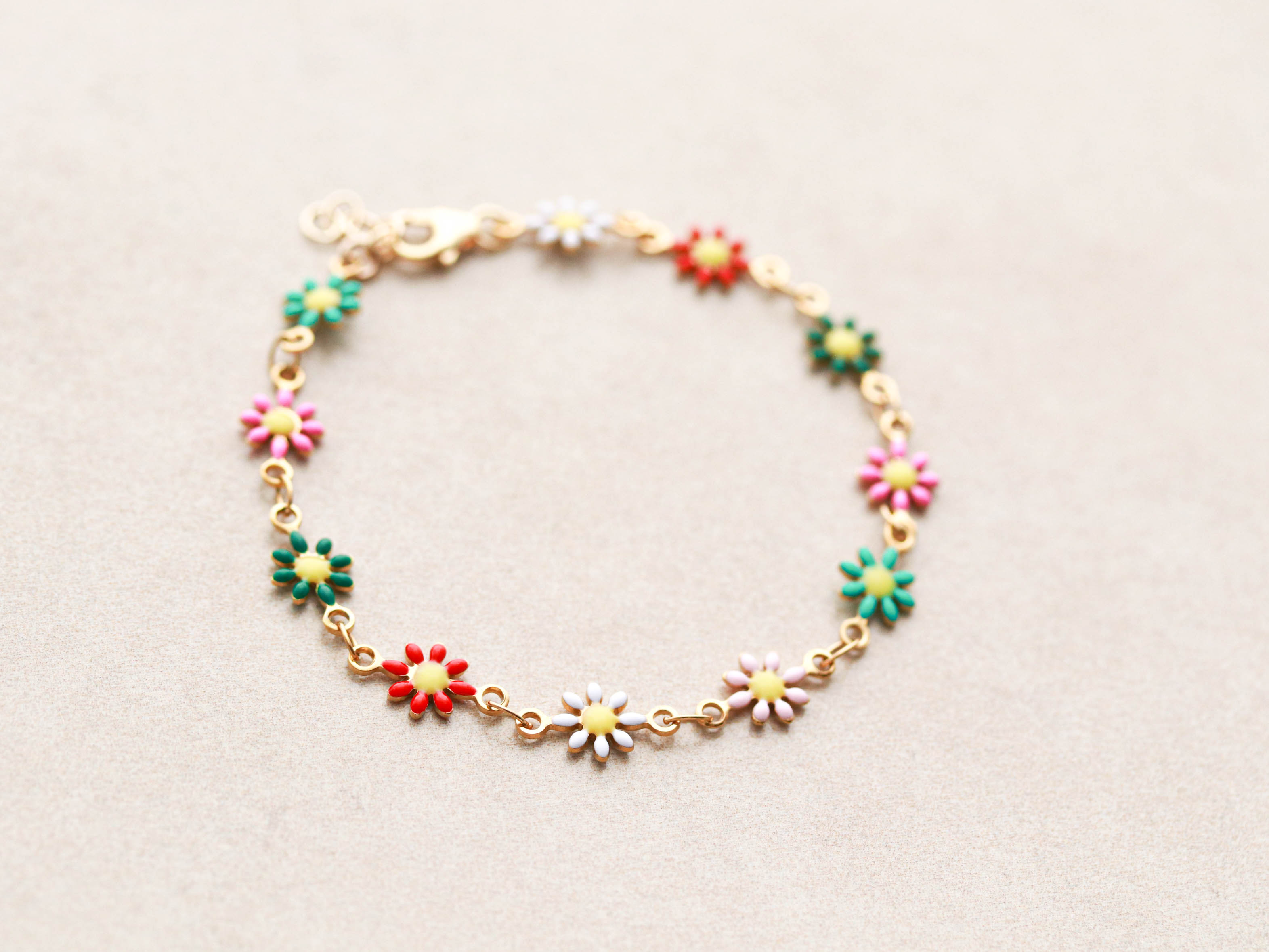The most anticipated chain from our followers! The Daisy chain is made up of adorable, enamel coated daisies in pink, white, or the colorful multi. This bracelet stacks well with other chains in our shop or looks great worn by itself, we love it with the dot, herringbone and pearl bracelets. Bracelets come with an extender for an adjustable fit. Made with waterproof materials - 18k gold electroplated stainless steel, 14k gold filled clasp and extenders.