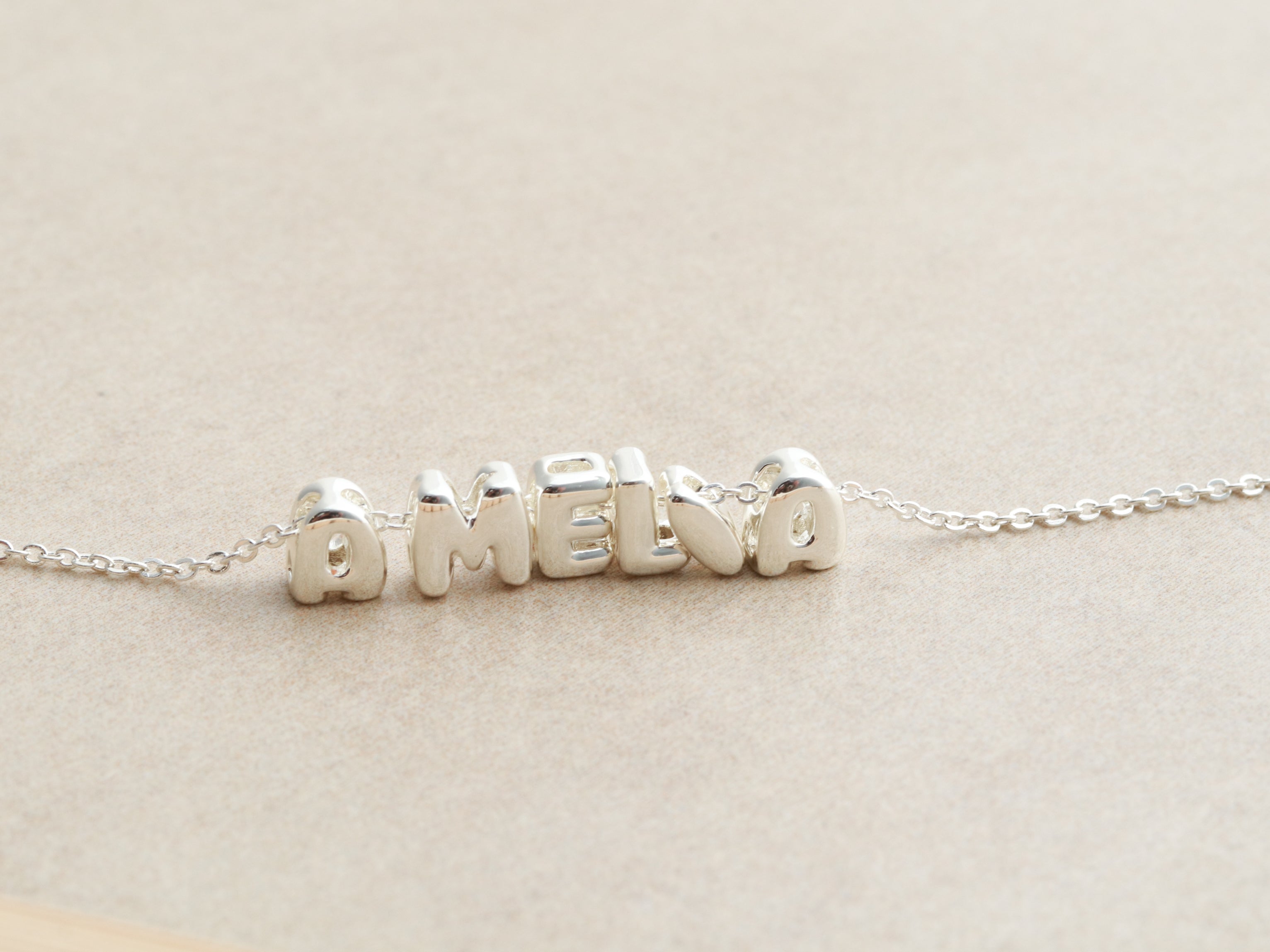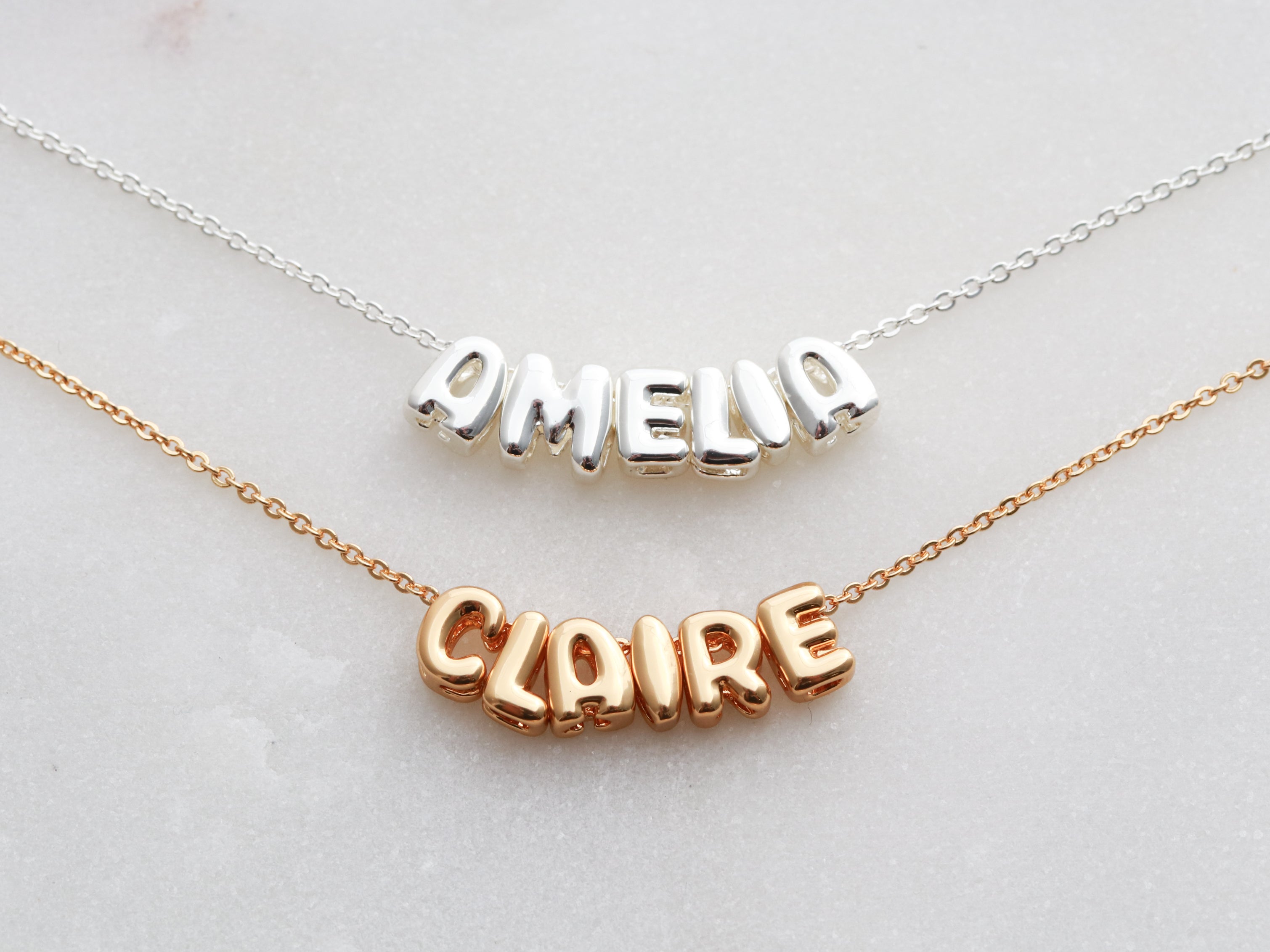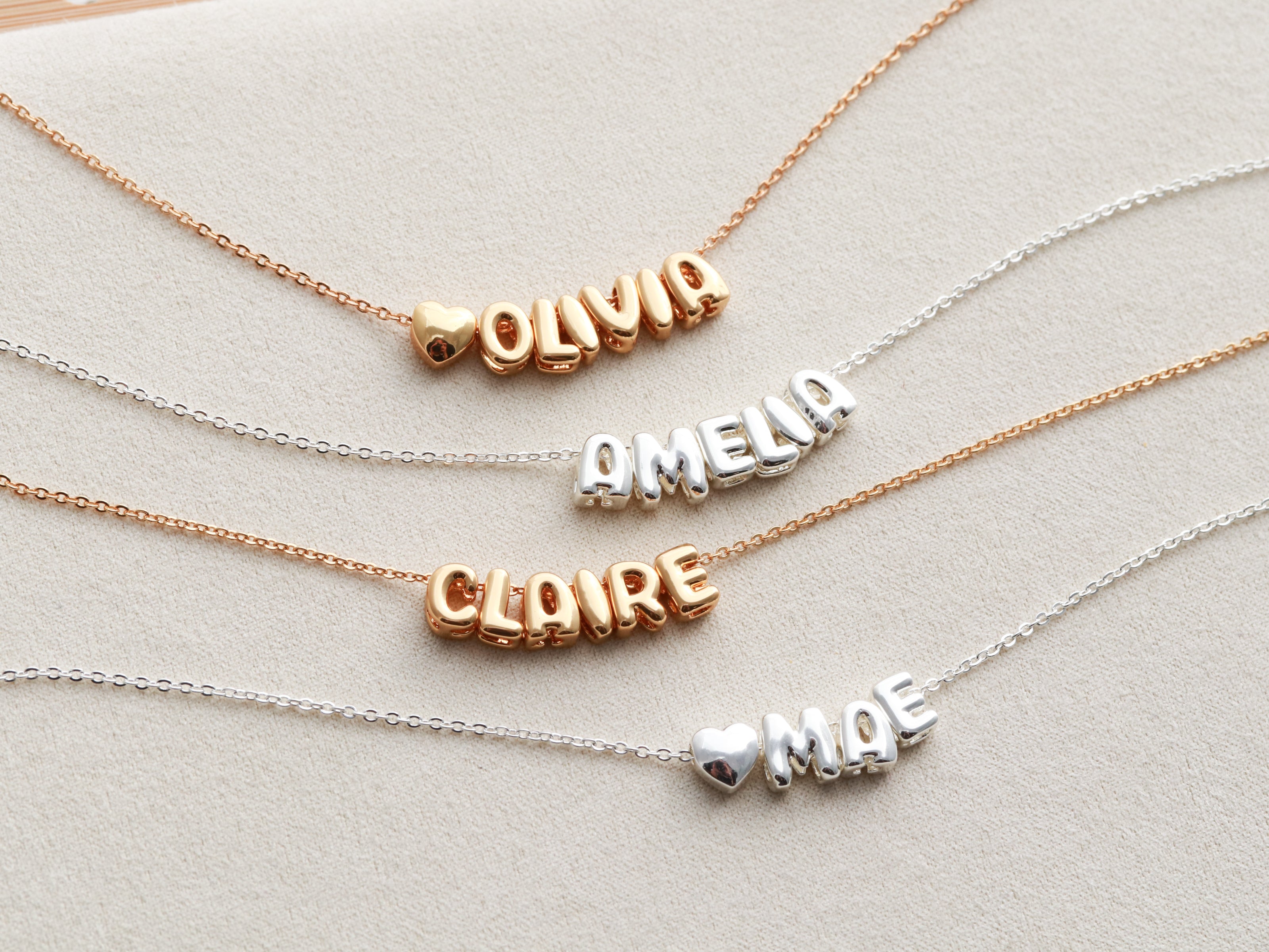 Create a one-of-a-kind Name Necklace, designed to spell out any name or meaningful word in gold or silver bubble letters. Whether it’s your own name, a loved one’s, or a special word that inspires you, this custom necklace is the perfect way to keep it close to your heart.