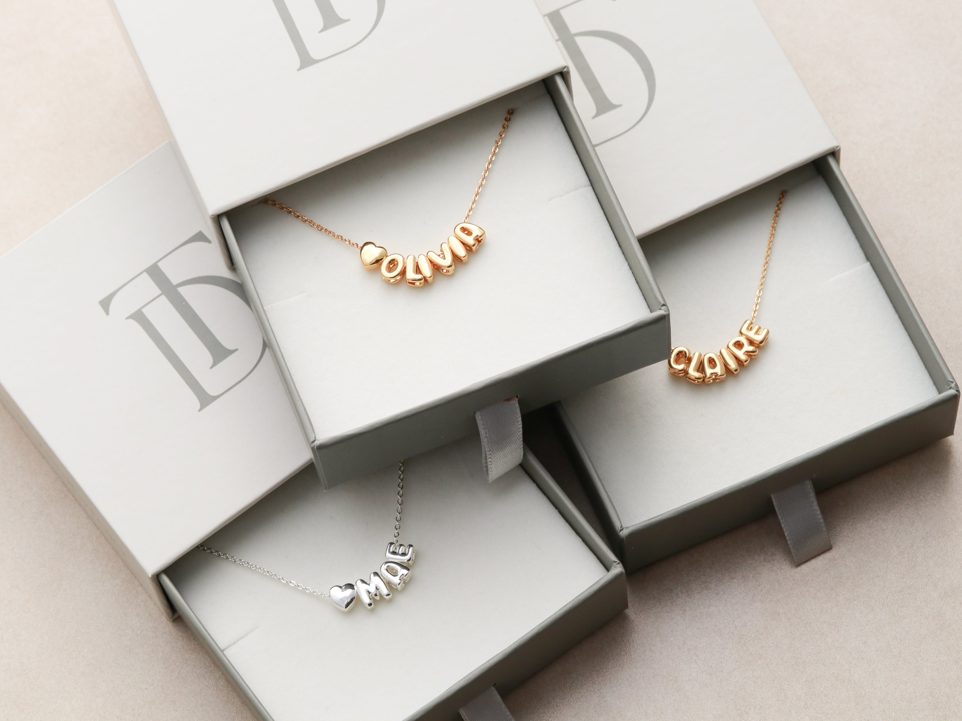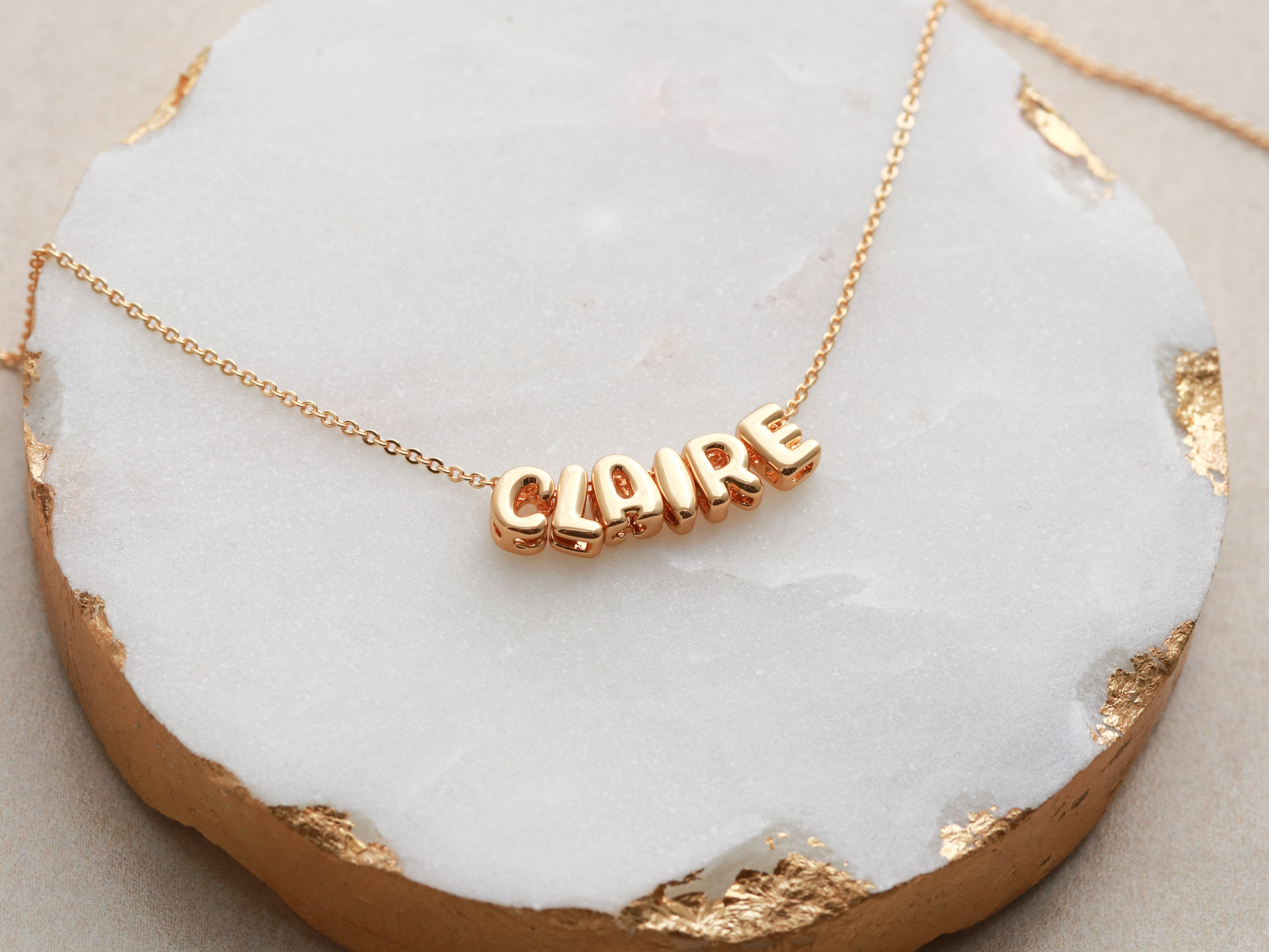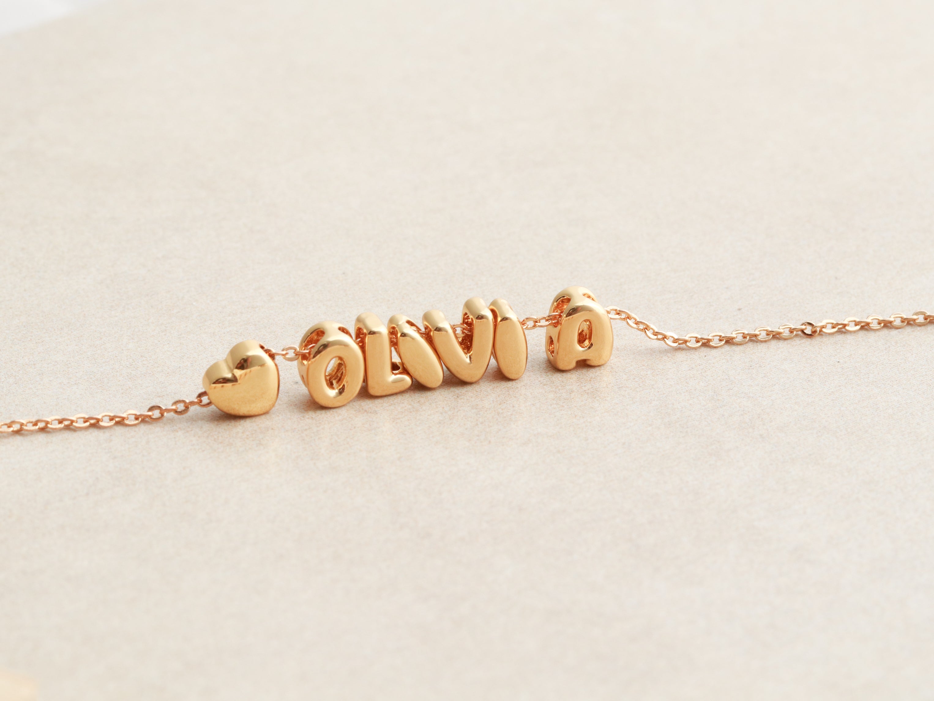 Create a one-of-a-kind Name Necklace, designed to spell out any name or meaningful word in gold or silver bubble letters. Whether it’s your own name, a loved one’s, or a special word that inspires you, this custom necklace is the perfect way to keep it close to your heart.