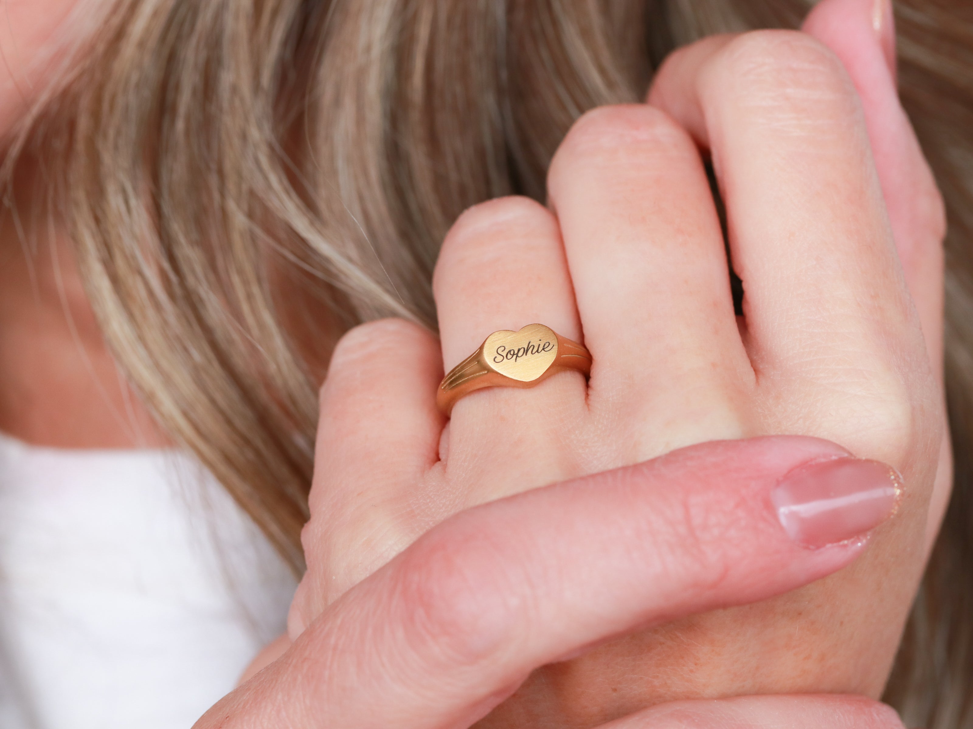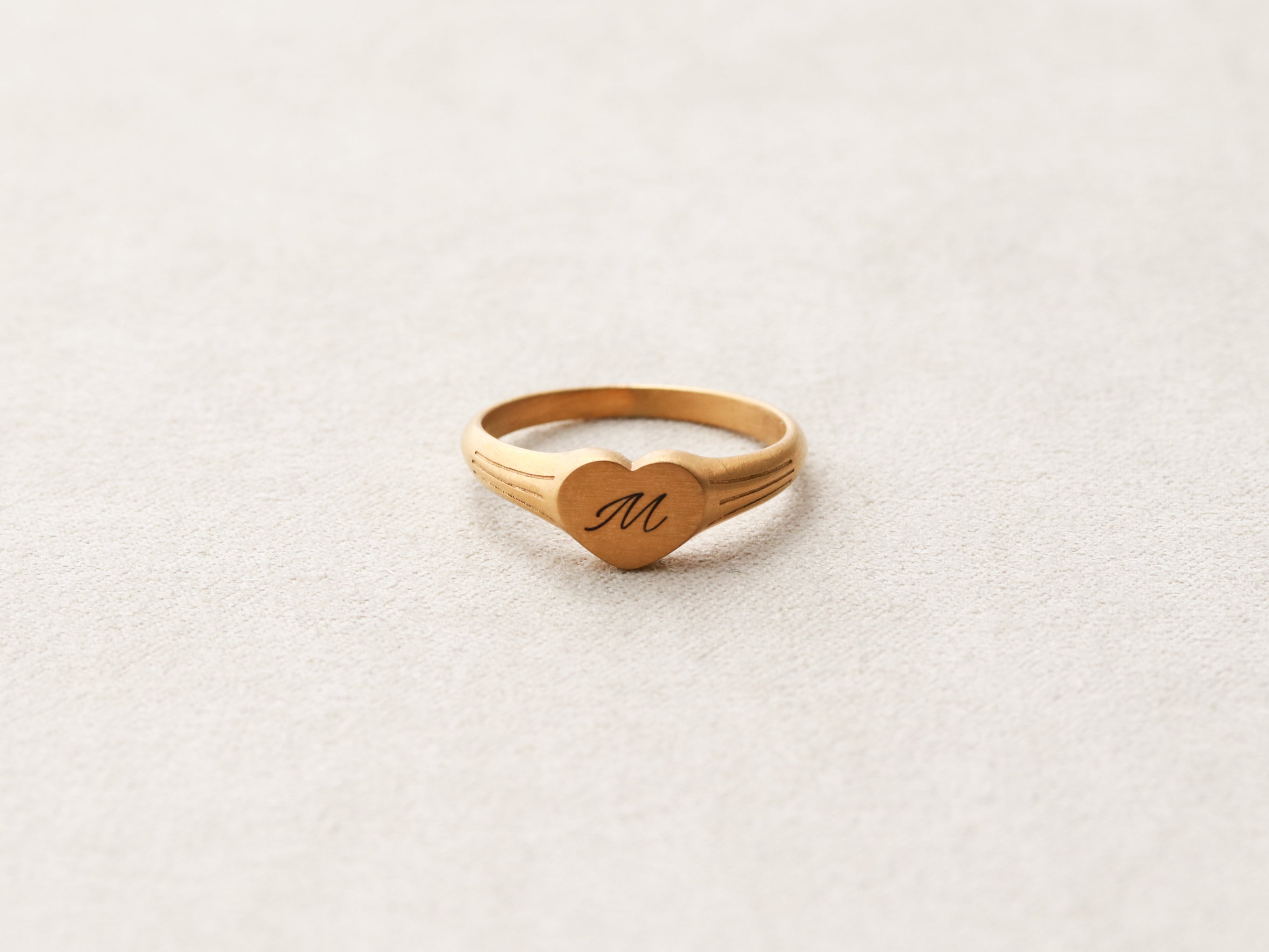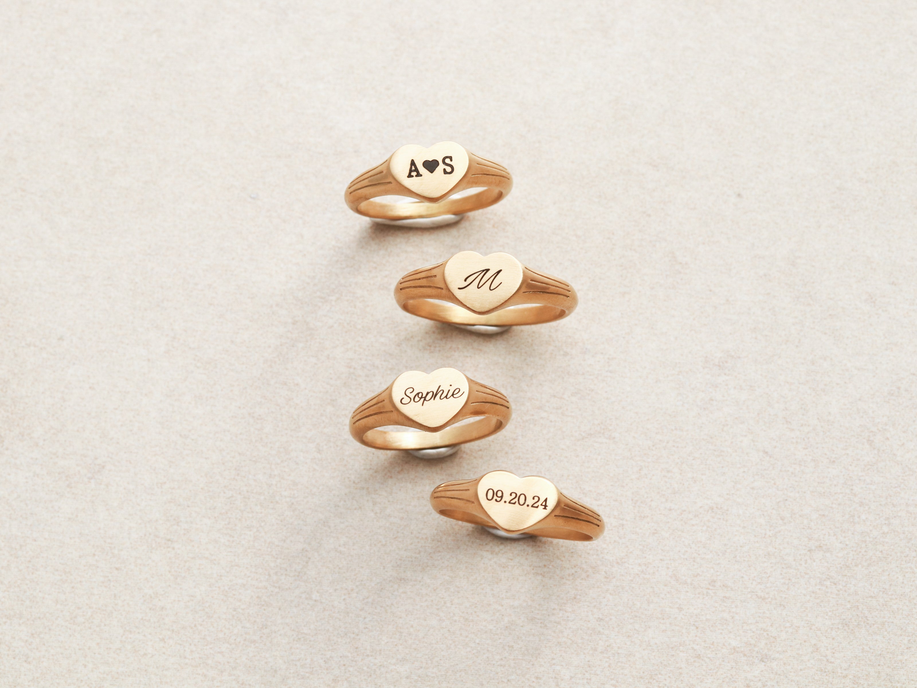 Our Signet Heart Rings are crafted from durable 18k gold-plated stainless steel with a brushed finish. Personalize with a name, a special date, a meaningful word, or an initial. All of our rings are custom engraved in our studio and make perfect gifts for any special occasion.