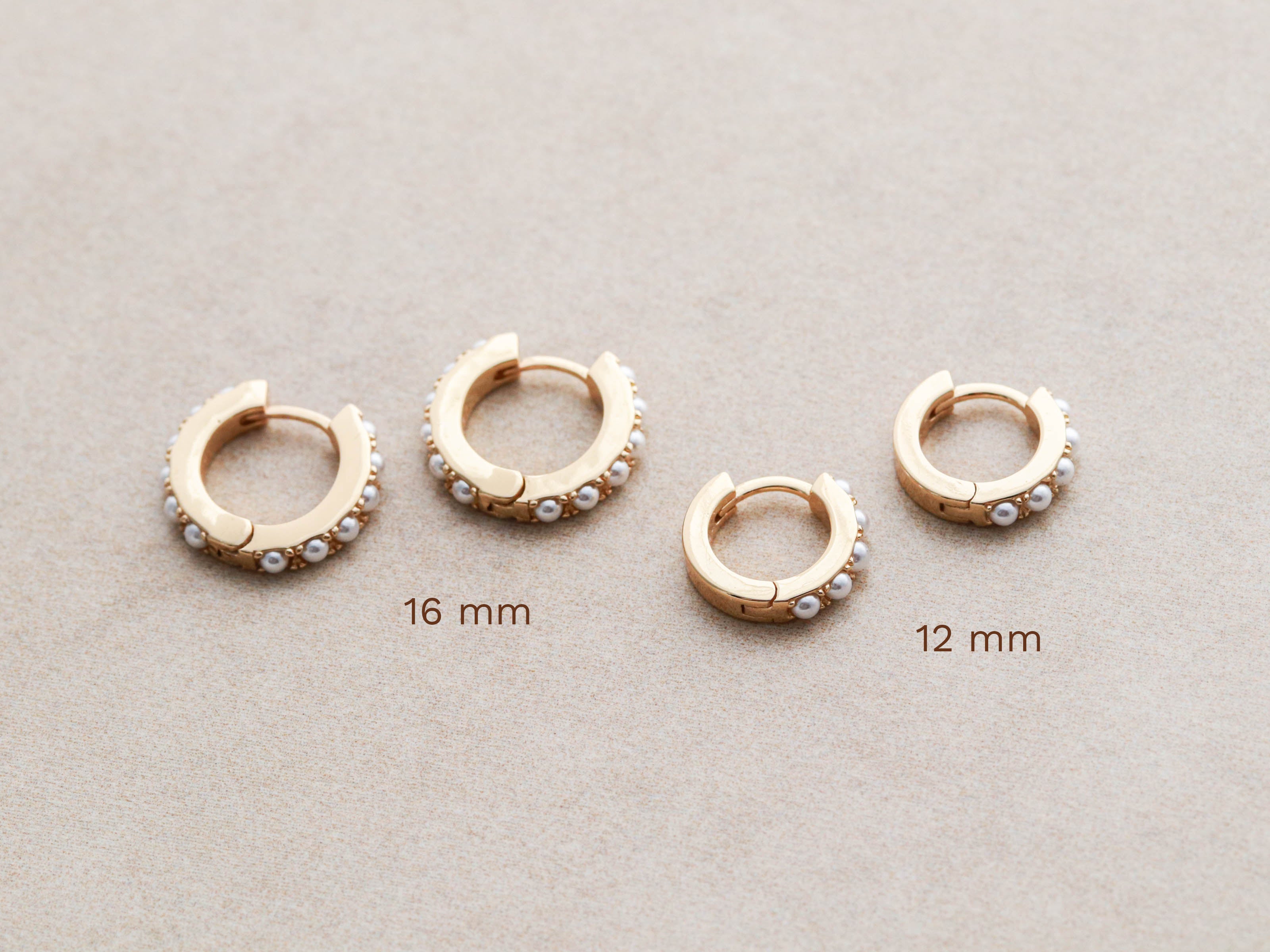 Classic design and texture, our 16mm Pearl Huggies feature a smooth hoop with studded pearls for a timeless, polished look. Perfect for everyday wear and stacking with our huggie collection or flat backs.