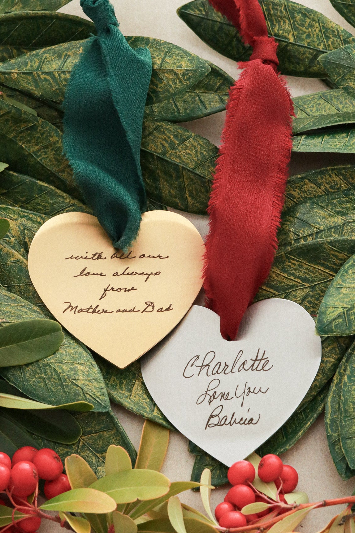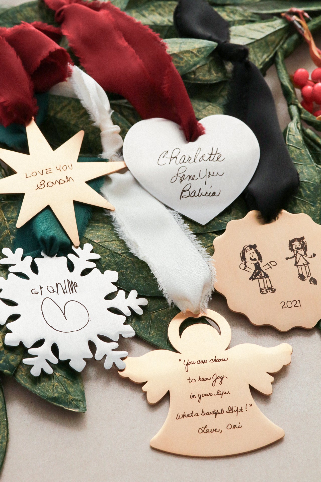 Actual signatures, drawings, and messages from loved ones engraved onto our premium stainless steel ornaments, in five shapes. Our customers' most common response to our handwriting pieces are that they produce "happy tears". All we need is a photo of the writing to create your holiday keepsake.
