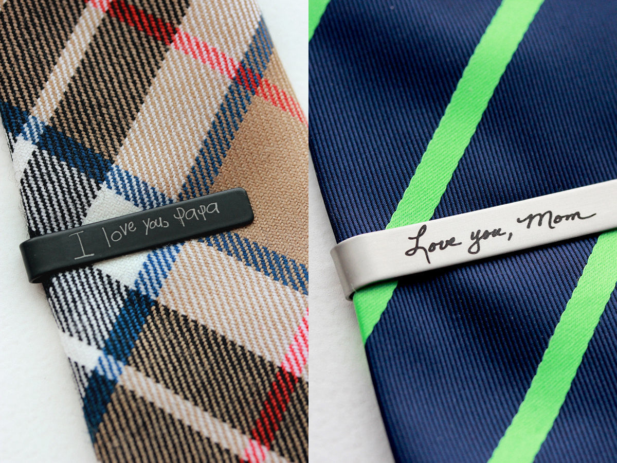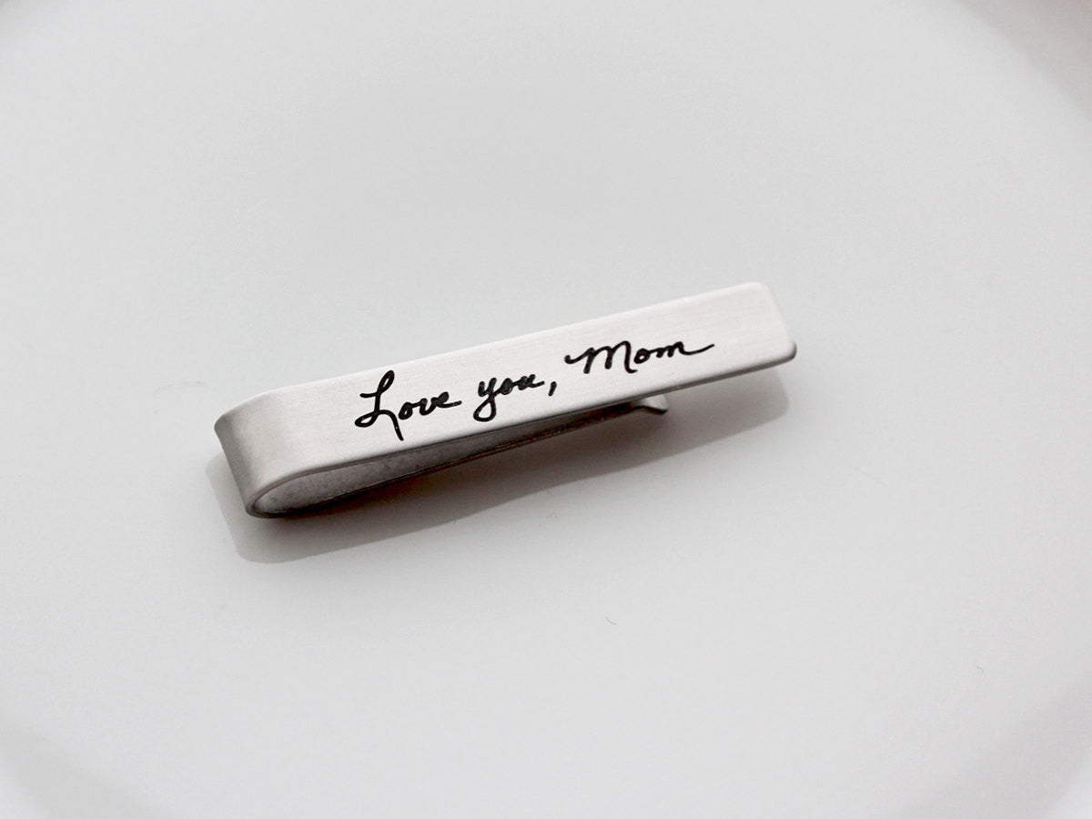 Custom Handwriting Tie Clip made from stainless steel materials. These can be children's handwriting, handwriting from grandparents, parents, and loved ones. Preserve the past with these custom tie clips. Makes great gifts for men and groomsmen.