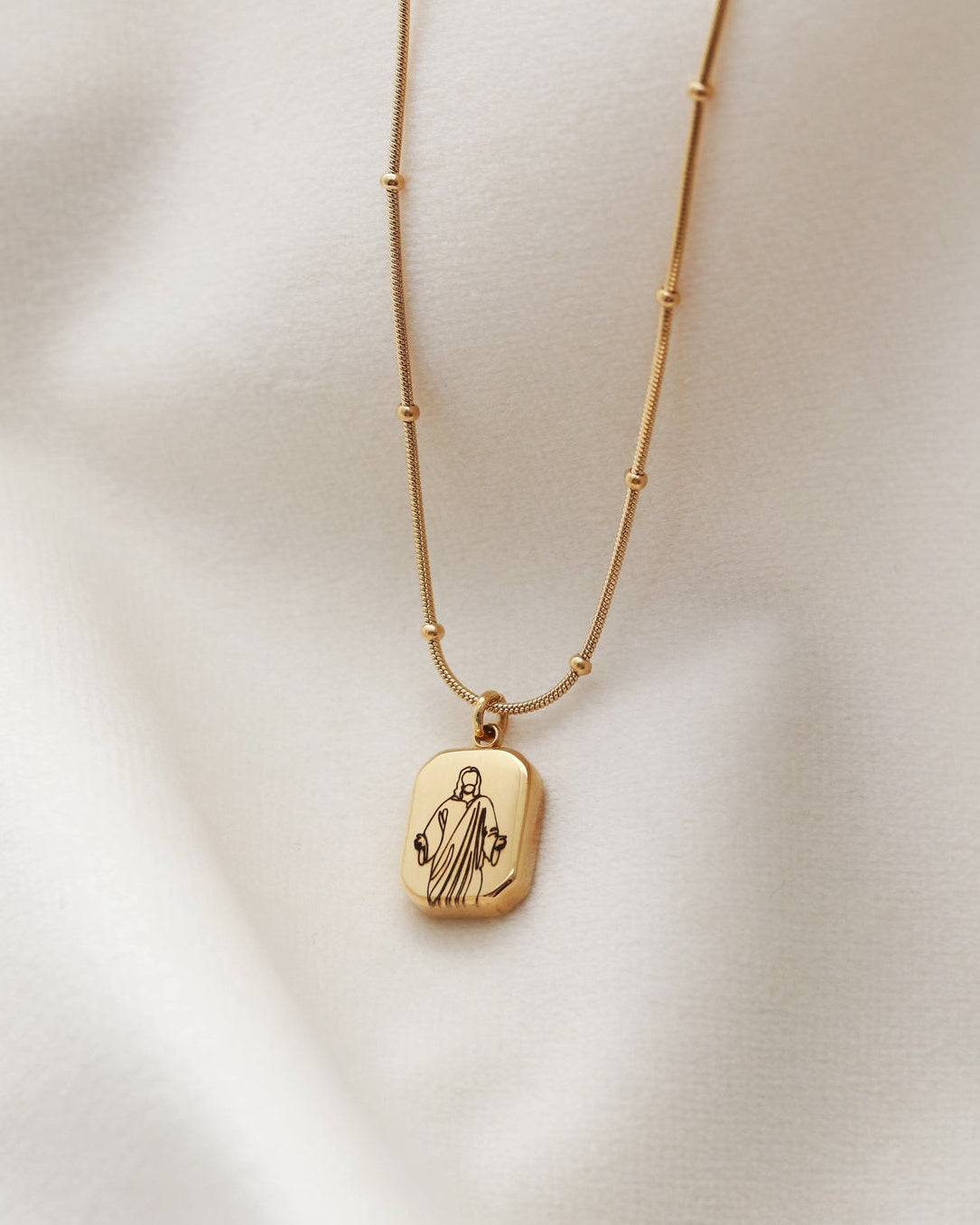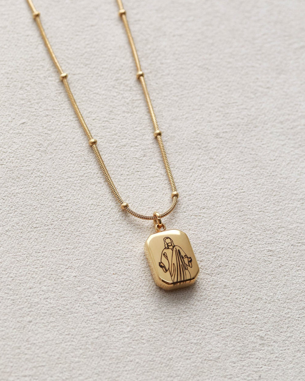 Our Christ Necklace features a delicate line art image of the Savior, engraved onto a gold octagon pendant. Waterproof and tarnish-resistant, this faith necklace for women is a beautiful daily reminder of devotion, hope, and Christ’s love.