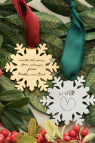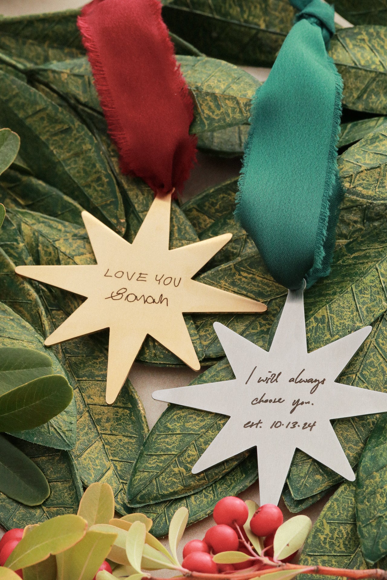Actual signatures, drawings, and messages from loved ones engraved onto our premium stainless steel ornaments, in five shapes. Our customers' most common response to our handwriting pieces are that they produce "happy tears". All we need is a photo of the writing to create your holiday keepsake.
