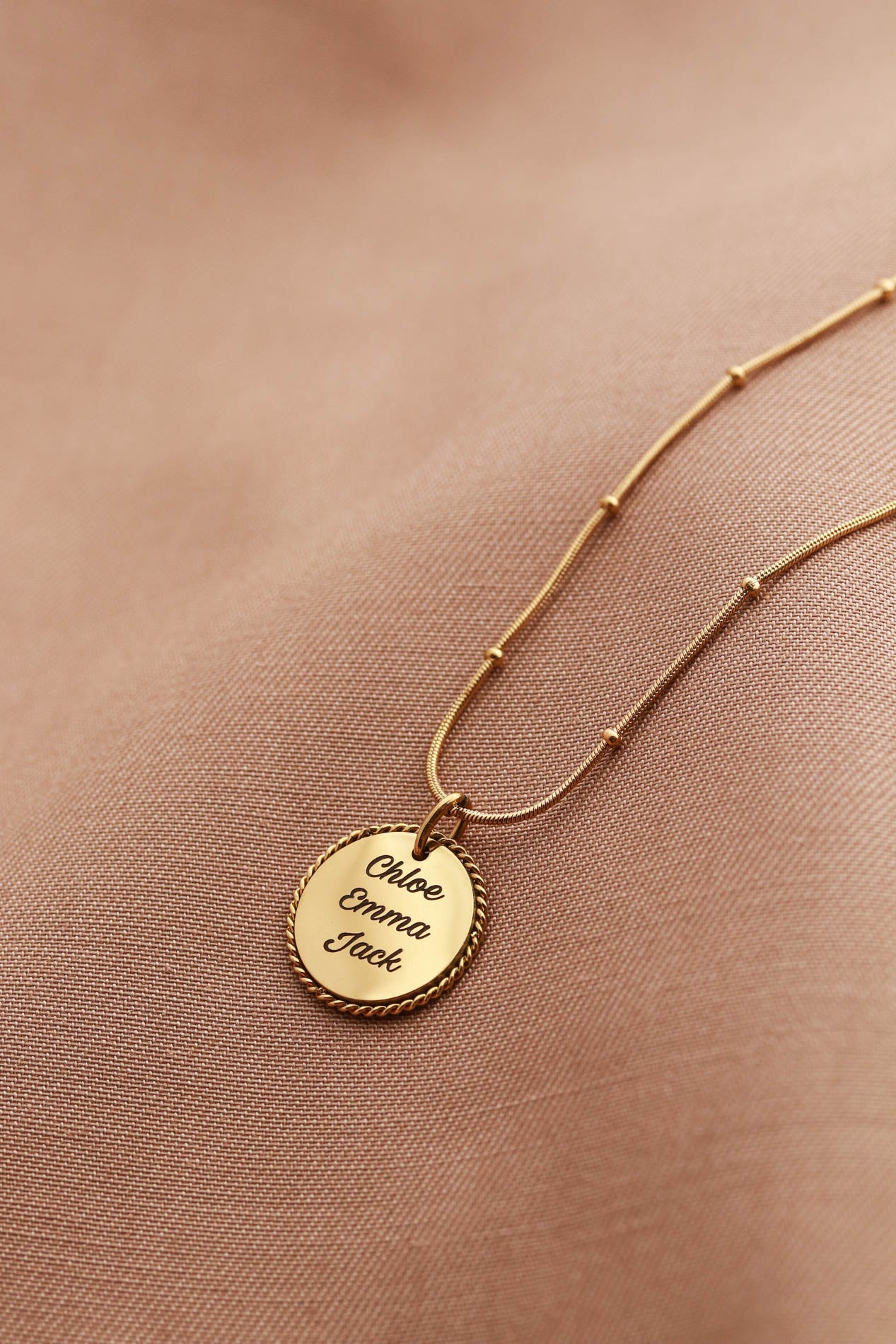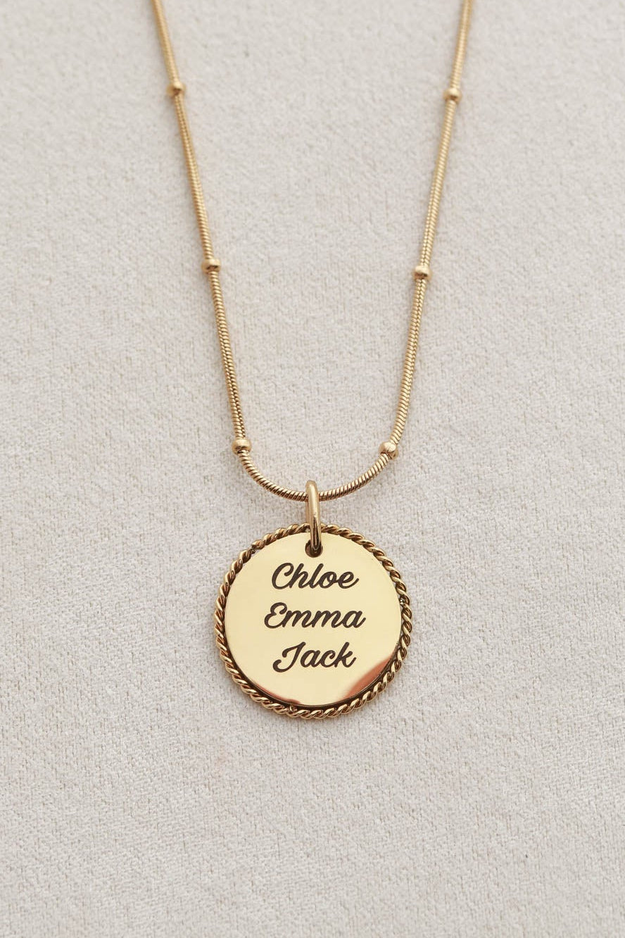 A classic rope pendant customized your way. Engrave initials, names, dates, coordinates, or meaningful words to create a beautiful piece of everyday jewelry. Optional back engraving allows you to add an extra moment, message, or symbol.