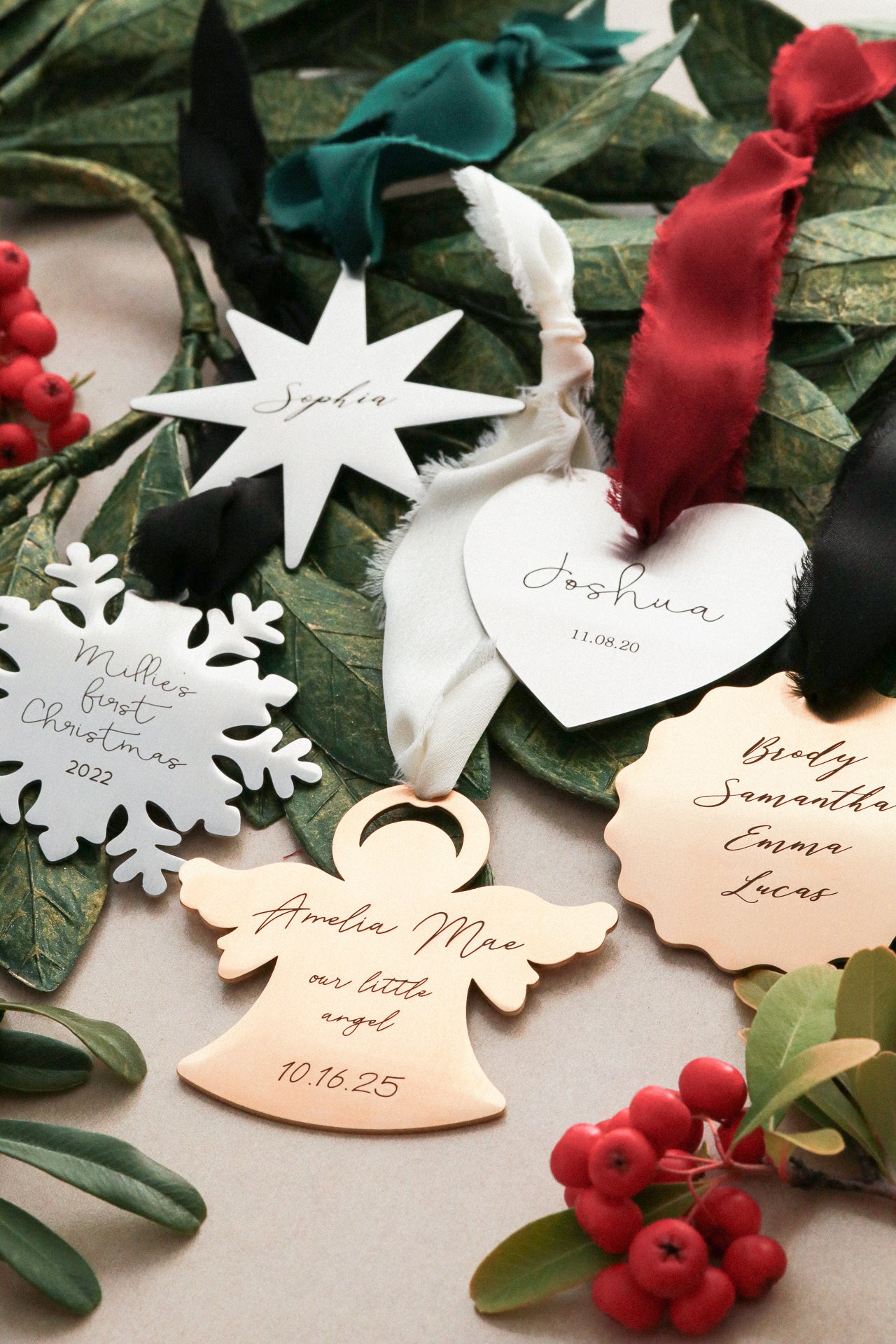 A timeless Christmas keepsake, personalized just for your family. Our ornaments can be engraved with family names, sayings, scriptures, memorials, baby's 1st, anniversaries, announcements, anything that makes your holiday keepsake special. Five stainless steel ornament shapes in a satin brushed finish
