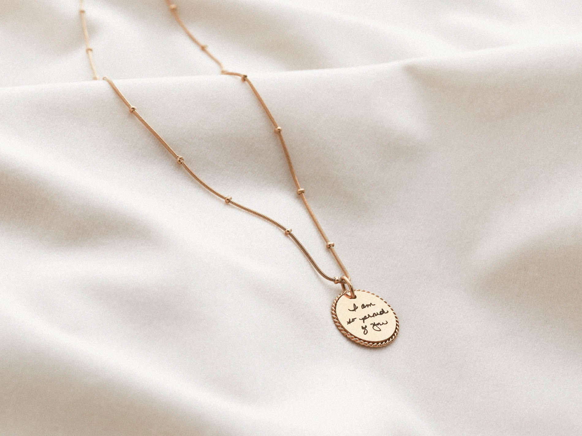 Capture the handwriting of someone you love on a beautifully textured rope pendant. Engraved using your actual handwriting image, this necklace turns notes, signatures, and meaningful messages into a wearable keepsake you can hold close every day.